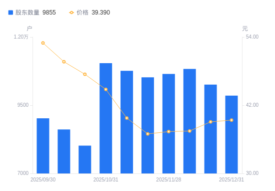 近一年(2024年12月31日至2025年12月31日),信邦智能A股股东户数从1.09万户,减低至9855户,降幅9.39%,区间股价上涨62.84%。