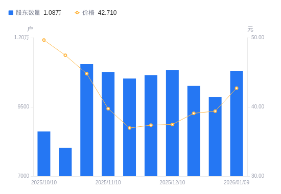 1月14日消息,数据显示,截至2026年1月9日,信邦智能A股股东总户数为1.08万户,较上期(2025年12月31日)增加950户,增幅9.64%。公司最新A股总股本为1.1亿股,其中流通A股1.1亿股,户均持有流通A股数量为1.02万股,较上期减少983.75股,降幅8.79%;户均持流通A股市值43.59万元,较上期减少4868.95元,降幅1.10%。