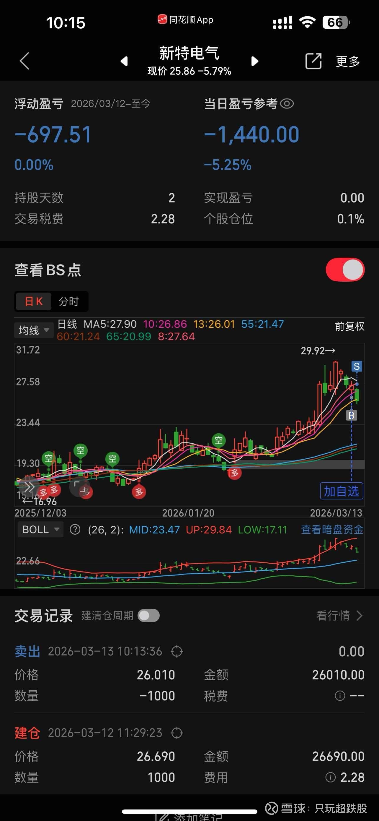 易天股份这波真的是我策略上判断失误了,上周四高点赚那么多贪心没出,导致连续调整了这么多天,现在市场果然是不能格局的,赚到一定的利润就要卖出,贪心是没有好结果的,接下来不排除会进行调仓换股,死扛等回本有难度,还不如主动去切换强势股,早点把损失吃回来。