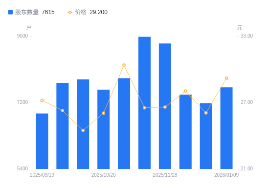 1月13日消息,数据显示,截至2026年1月9日,采纳股份A股股东总户数为7615户,较上期(2025年12月31日)增加431户,增幅6.00%。公司最新A股总股本为1.22亿股,其中流通A股7564.07万股,户均持有流通A股数量为9933.11股,较上期减少595.93股,降幅5.66%;户均持流通A股市值29万元,较上期增加1.57万元,增幅5.71%。