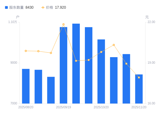 近一年(2024年11月20日至2025年11月20日),腾亚精工A股股东户数从1.03万户,减低至8430户,降幅17.90%,区间股价上涨52.64%。