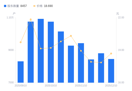 近一年(2024年12月10日至2025年12月10日),腾亚精工A股股东户数从9137户,减低至8457户,降幅7.44%,区间股价上涨56.80%。
