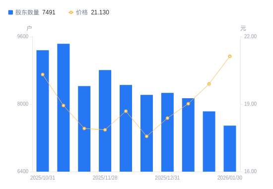 2月3日消息,数据显示,截至2026年1月30日,腾亚精工A股股东总户数为7491户,较上期(2026年1月20日)减少337户,降幅4.31%。公司最新A股总股本为1.42亿股,其中流通A股1.26亿股,户均持有流通A股数量为1.68万股,较上期增加722.17股,增幅4.50%;户均持流通A股市值35.45万元,较上期增加3.5万元,增幅10.96%。