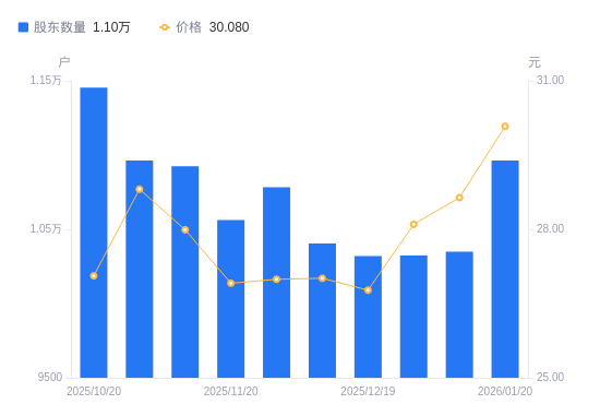 1月27日消息,数据显示,截至2026年1月20日,瑞德智能A股股东总户数为1.1万户,较上期(2026年1月9日)增加614户,增幅5.93%。公司最新A股总股本为1.02亿股,其中流通A股7646.07万股,户均持有流通A股数量为6974.44股,较上期减少413.79股,降幅5.60%;户均持流通A股市值20.98万元,较上期减少1807.73元,降幅0.85%。