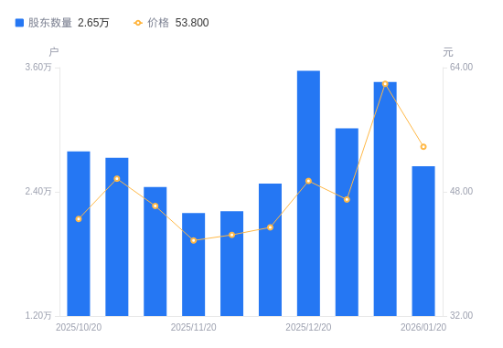 1月29日消息,数据显示,截至2026年1月20日,哈焊华通A股股东总户数为2.65万户,较上期(2026年1月10日)减少8140户,降幅23.53%。公司最新A股总股本为1.82亿股,其中流通A股1.82亿股,户均持有流通A股数量为6871.25股,较上期增加1616.53股,增幅30.76%;户均持流通A股市值36.97万元,较上期增加4.44万元,增幅13.63%。