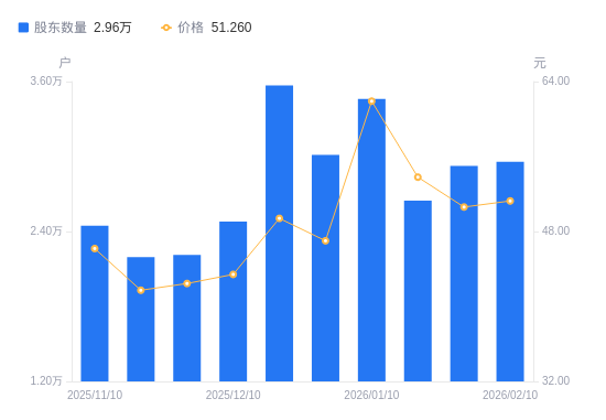 2月12日消息,数据显示,截至2026年2月10日,哈焊华通A股股东总户数为2.96万户,较上期(2026年1月31日)增加311户,增幅1.06%。公司最新A股总股本为1.82亿股,其中流通A股1.82亿股,户均持有流通A股数量为6148.37股,较上期减少65.35股,降幅1.05%;户均持流通A股市值31.52万元,较上期增加689.07元,增幅0.22%。