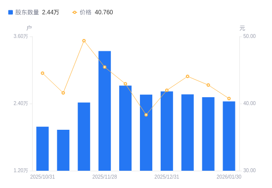 2月2日消息,数据显示,截至2026年1月30日,中一科技A股股东总户数为2.44万户,较上期(2026年1月20日)减少766户,降幅3.05%。公司最新A股总股本为2.33亿股,其中流通A股2.23亿股,户均持有流通A股数量为9126.84股,较上期增加277.93股,增幅3.14%;户均持流通A股市值37.2万元,较上期减少6457.7元,降幅1.71%。