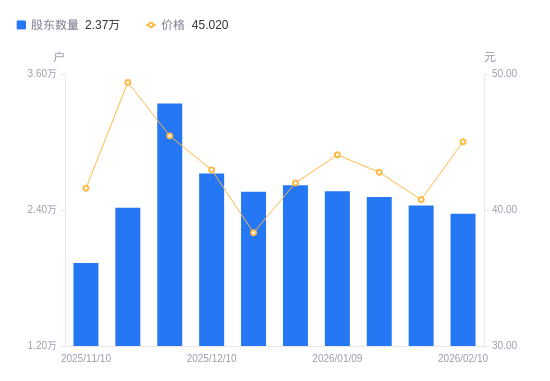 2月11日消息,数据显示,截至2026年2月10日,中一科技A股股东总户数为2.37万户,较上期(2026年1月30日)减少729户,降幅2.99%。公司最新A股总股本为2.33亿股,其中流通A股2.23亿股,户均持有流通A股数量为9408.06股,较上期增加281.22股,增幅3.08%;户均持流通A股市值42.36万元,较上期增加5.15万元,增幅13.85%。