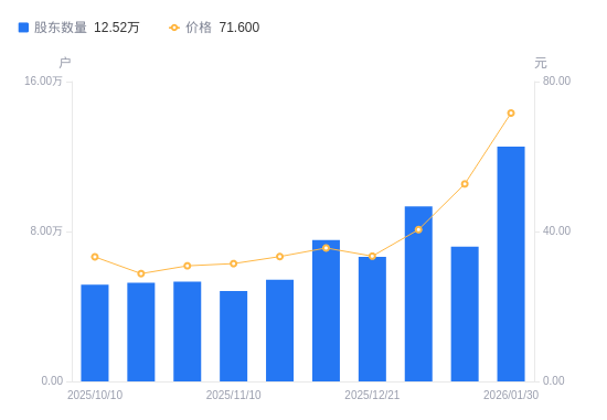 近一年(2025年2月28日至2026年1月30日),易点天下A股股东户数从5.68万户,增加至12.52万户,增幅120.63%,区间股价上涨141.53%。