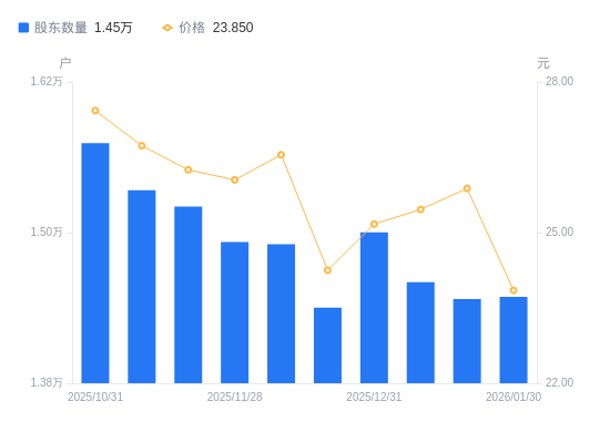 近一年(2025年2月20日至2026年1月30日),逸豪新材A股股东户数从1.34万户,增加至1.45万户,增幅7.73%,区间股价上涨30.61%。