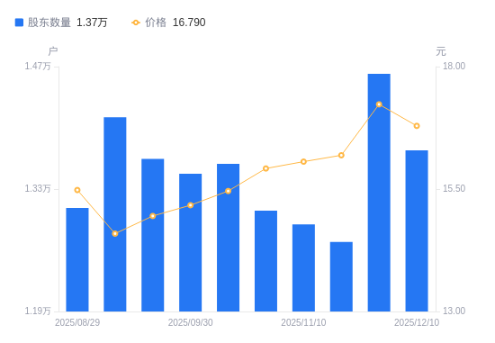 近一年(2024年12月20日至2025年12月10日),万祥科技A股股东户数从1.53万户,减低至1.37万户,降幅10.10%,区间股价下跌4.38%。