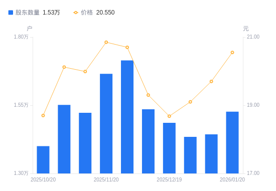 近一年(2025年1月20日至2026年1月20日),鸥玛软件A股股东户数从1.53万户,增加至1.53万户,增幅0.09%,区间股价上涨24.62%。