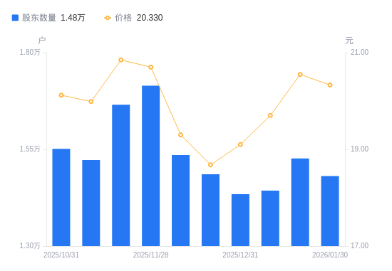 近一年(2025年2月28日至2026年1月30日),鸥玛软件A股股东户数从1.4万户,增加至1.48万户,增幅6.09%,区间股价上涨6.72%。