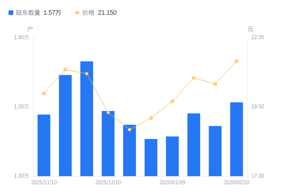 近一年(2025年2月28日至2026年2月10日),鸥玛软件A股股东户数从1.4万户,增加至1.57万户,增幅12.21%,区间股价上涨11.02%。