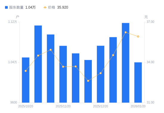 近一年(2025年1月31日至2026年1月20日),北路智控A股股东户数从1.1万户,减低至1.04万户,降幅5.12%,区间股价上涨15.05%。