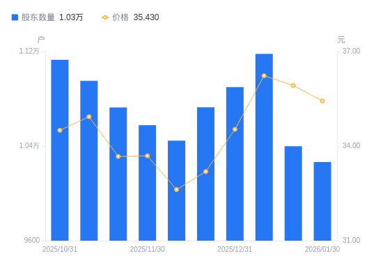 近一年(2025年1月31日至2026年1月30日),北路智控A股股东户数从1.1万户,减低至1.03万户,降幅6.35%,区间股价上涨13.48%。
