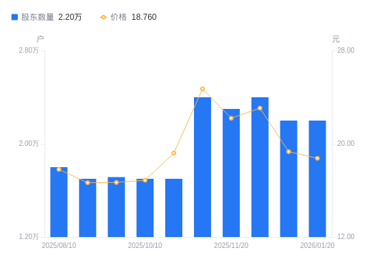 近一年(2025年2月28日至2026年1月20日),华兰疫苗A股股东户数从1.74万户,增加至2.2万户,增幅26.76%,区间股价上涨8.70%。