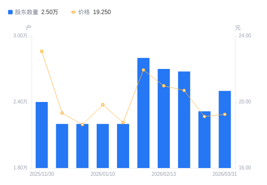 4月1日消息,数据显示,截至2026年3月20日,华兰疫苗A股股东总户数为2.32万户,较上期(2026年2月28日)减少3619户,降幅13.52%。公司最新A股总股本为6.01亿股,其中流通A股6.01亿股,户均持有流通A股数量为2.59万股,较上期增加3506.6股,增幅15.63%;户均持流通A股市值49.6万元,较上期增加3.16万元,增幅6.80%。