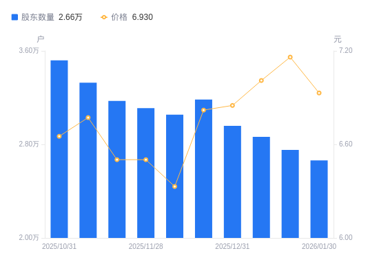 近一年(2025年2月10日至2026年1月30日),中汽股份A股股东户数从3.4万户,减低至2.66万户,降幅21.74%,区间股价上涨15.12%。