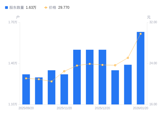 近一年(2025年1月20日至2026年1月20日),华是科技A股股东户数从1.52万户,增加至1.63万户,增幅7.24%,区间股价上涨43.57%。