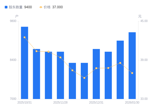 近一年(2025年2月10日至2026年1月30日),亚香股份A股股东户数从5400户,增加至9400户,增幅74.07%,区间股价上涨6.62%。