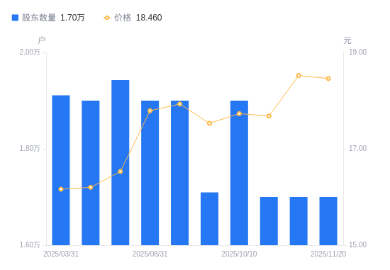 近一年(2024年12月20日至2025年11月20日),中荣股份A股股东户数从1.96万户,减低至1.7万户,降幅13.27%,区间股价上涨10.20%。