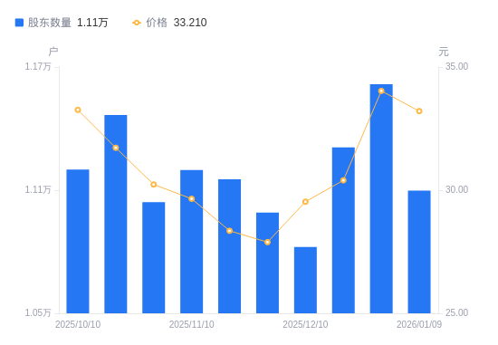 近一年(2025年1月27日至2026年1月9日),祥明智能A股股东户数从1.08万户,增加至1.11万户,增幅2.77%,区间股价上涨35.39%。