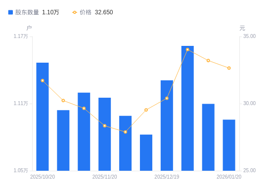 近一年(2025年1月27日至2026年1月20日),祥明智能A股股东户数从1.08万户,增加至1.1万户,增幅1.46%,区间股价上涨33.10%。