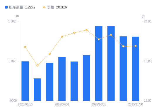 近一年(2024年12月20日至2025年11月30日),纽泰格A股股东户数从9252户,增加至1.22万户,增幅32.28%,区间股价上涨24.65%。