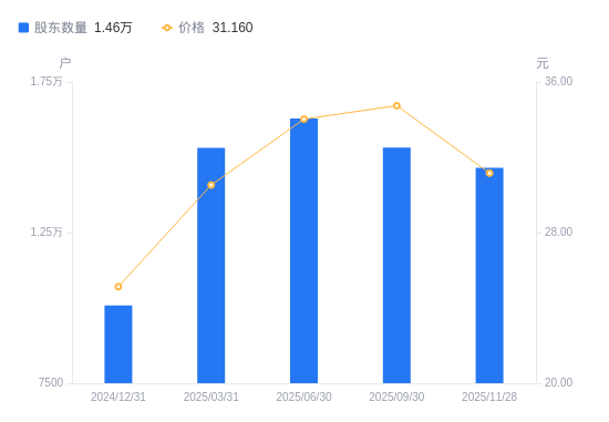近一年(2024年12月31日至2025年11月28日),泓博医药A股股东户数从1.01万户,增加至1.46万户,增幅45.27%,区间股价上涨15.21%。