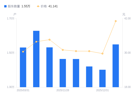 1月26日消息,数据显示,截至2026年1月9日,泓博医药A股股东总户数为1.55万户,较上期(2025年12月31日)增加1477户,增幅10.54%。公司最新A股总股本为1.4亿股,其中流通A股1.26亿股,户均持有流通A股数量为8106.34股,较上期减少854.06股,降幅9.53%;户均持流通A股市值33.35万元,较上期增加6.67万元,增幅25.02%。