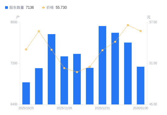 2月10日消息,数据显示,截至2026年1月30日,盛帮股份A股股东总户数为7136户,较上期(2026年1月20日)减少470户,降幅6.18%。公司最新A股总股本为5147万股,其中流通A股2818.06万股,户均持有流通A股数量为3949.08股,较上期增加244.03股,增幅6.59%;户均持流通A股市值22.01万元,较上期增加1.04万元,增幅4.97%。
