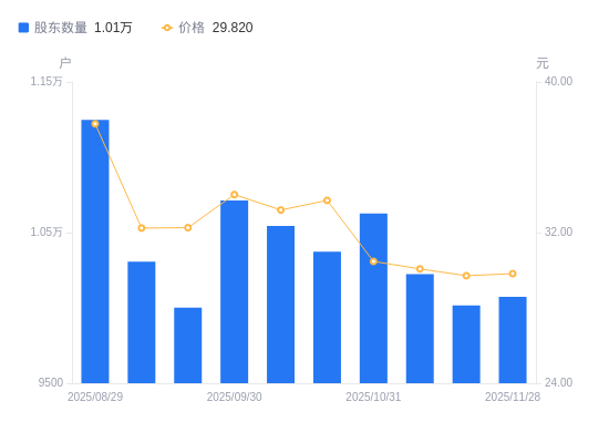 近一年(2024年11月29日至2025年11月28日),华康洁净A股股东户数从9587户,增加至1.01万户,增幅5.08%,区间股价上涨41.52%。