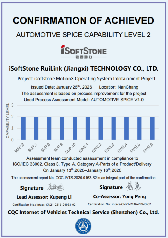目前,软通动力已与多家主流车企建立深度合作,持续为汽车产业智能化升级注入动能。未来,公司将以此次认证为新起点,持续优化研发流程,稳步向ASPICE更高等级认证进阶,致力于为全球汽车产业的数字化转型提供更高价值的服务。
