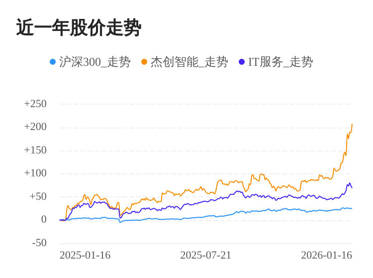 01月16日,杰创智能(301248)股价大涨。截至今日收盘,杰创智能上涨6.74%,收盘价为46.73元,收盘价创历史新高。