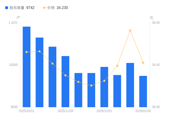 2月4日消息,数据显示,截至2026年1月30日,富士莱A股股东总户数为9742户,较上期(2026年1月20日)减少308户,降幅3.06%。公司最新A股总股本为9167万股,其中流通A股8906.5万股,户均持有流通A股数量为9142.37股,较上期增加280.18股,增幅3.16%;户均持流通A股市值31.29万元,较上期减少1.74万元,降幅5.28%。