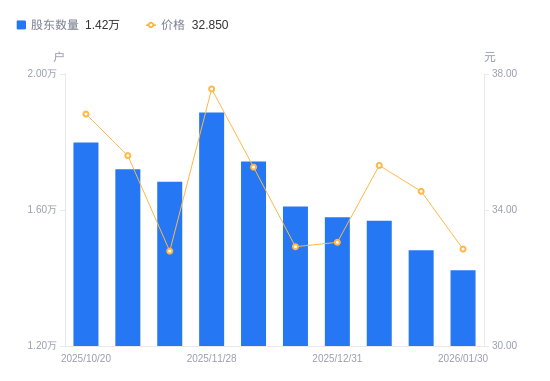 近一年(2025年2月28日至2026年1月30日),艾布鲁A股股东户数从6475户,增加至1.42万户,增幅119.74%,区间股价下跌37.42%。