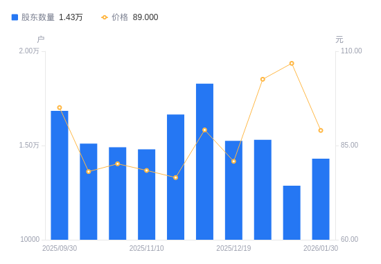 近一年(2025年2月10日至2026年1月30日),恒工精密A股股东户数从1.17万户,增加至1.43万户,增幅22.28%,区间股价上涨45.19%。