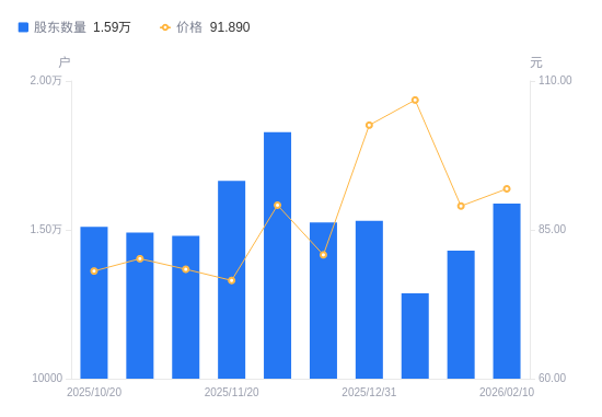 2月12日消息,数据显示,截至2026年2月10日,恒工精密A股股东总户数为1.59万户,较上期(2026年1月30日)增加1581户,增幅11.06%。公司最新A股总股本为8789.02万股,其中流通A股3748.33万股,户均持有流通A股数量为2360.56股,较上期减少261.02股,降幅9.96%;户均持流通A股市值21.69万元,较上期减少1.64万元,降幅7.03%。