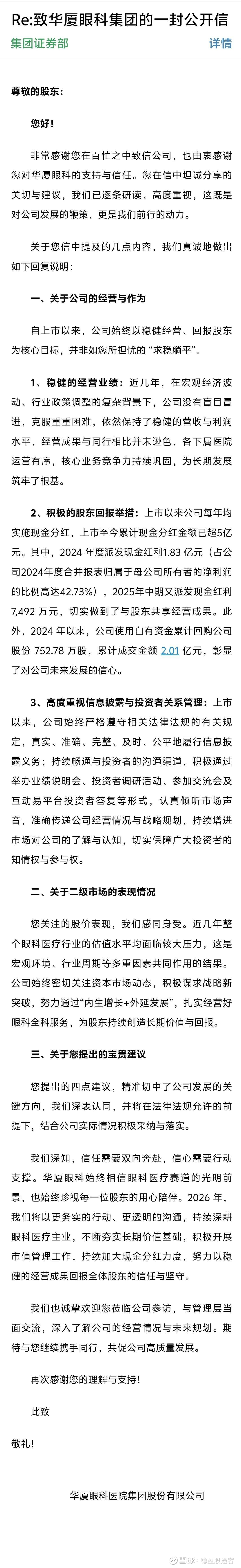 关于那封写给华厦眼科集团的信,公司昨天回复了。