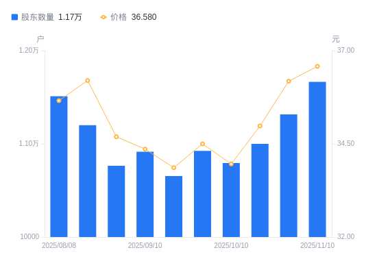 近一年(2024年11月20日至2025年11月10日),快可电子A股股东户数从1.24万户,减低至1.17万户,降幅5.86%,区间股价下跌4.31%。
