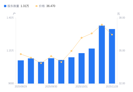 近一年(2024年11月29日至2025年11月28日),快可电子A股股东户数从1.2万户,增加至1.31万户,增幅9.22%,区间股价下跌2.95%。