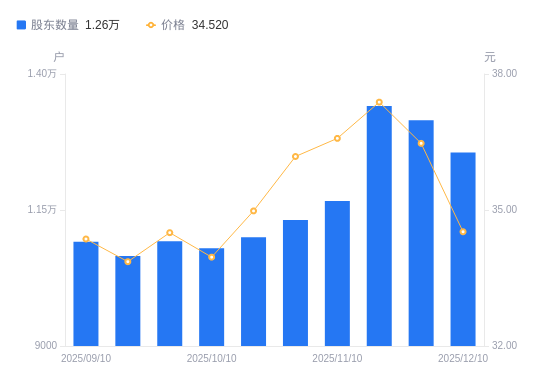 近一年(2024年12月10日至2025年12月10日),快可电子A股股东户数从1.21万户,增加至1.26万户,增幅3.66%,区间股价下跌6.80%。