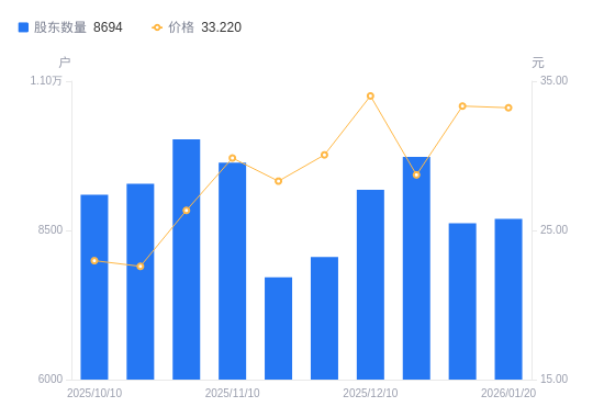 1月21日消息,数据显示,截至2026年1月20日,金道科技A股股东总户数为8694户,较上期(2026年1月9日)增加73户,增幅0.85%。公司最新A股总股本为1.3亿股,其中流通A股9805.15万股,户均持有流通A股数量为1.13万股,较上期减少95.5股,降幅0.84%;户均持流通A股市值37.47万元,较上期减少4423.58元,降幅1.17%。