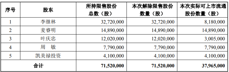 2月12日,金禄电子(301282)发布公告,披露关于首次公开发行前已发行部分股份上市流通的情况。本次上市流通的限售股份为7152万股,占公司总股本的47.3204%。解除限售的股东户数共计5户,解除限售股份的上市流通日期为2026年2月26日。