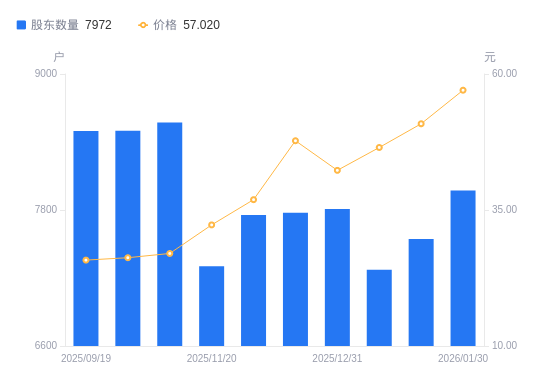 近一年(2025年2月10日至2026年1月30日),侨源股份A股股东户数从3723户,增加至7972户,增幅114.13%,区间股价上涨76.75%。