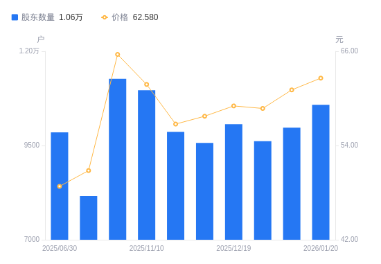 1月22日消息,数据显示,截至2026年1月20日,国缆检测A股股东总户数为1.06万户,较上期(2026年1月10日)增加607户,增幅6.09%。公司最新A股总股本为7800万股,其中流通A股7755.21万股,户均持有流通A股数量为7330.76股,较上期减少446.23股,降幅5.74%;户均持流通A股市值45.88万元,较上期减少1.63万元,降幅3.42%。