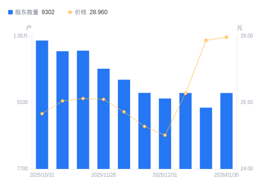 2月5日消息,数据显示,截至2026年1月30日,东星医疗A股股东总户数为9302户,较上期(2026年1月20日)增加309户,增幅3.44%。公司最新A股总股本为1亿股,其中流通A股6816.09万股,户均持有流通A股数量为7327.55股,较上期减少251.78股,降幅3.32%;户均持流通A股市值21.22万元,较上期减少6381.89元,降幅2.92%。
