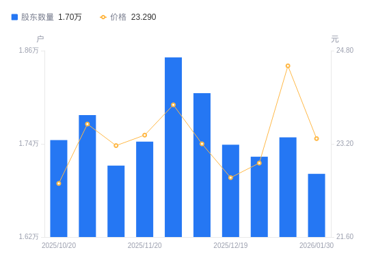 近一年(2025年2月10日至2026年1月30日),华如科技A股股东户数从2.03万户,减低至1.7万户,降幅16.30%,区间股价上涨0.39%。
