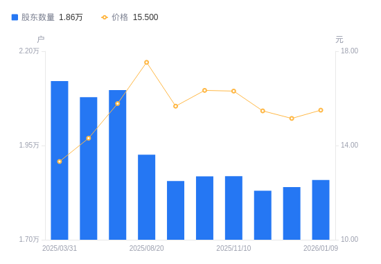 近一年(2025年3月31日至2026年1月9日),真兰仪表A股股东户数从2.12万户,减低至1.86万户,降幅12.37%,区间股价上涨15.67%。